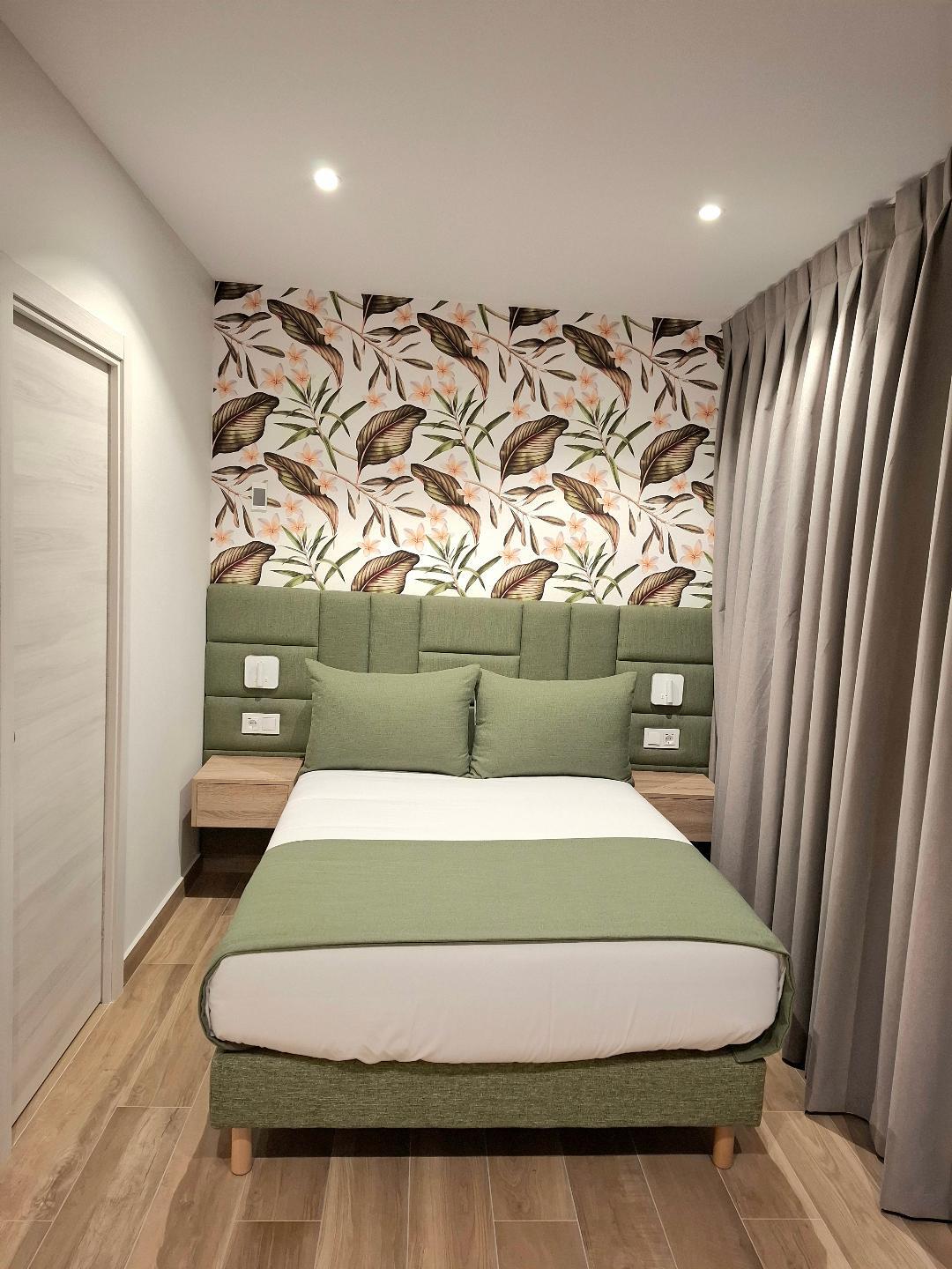 Cama con cojines verdes frente a papel tapiz de hojas y flores.