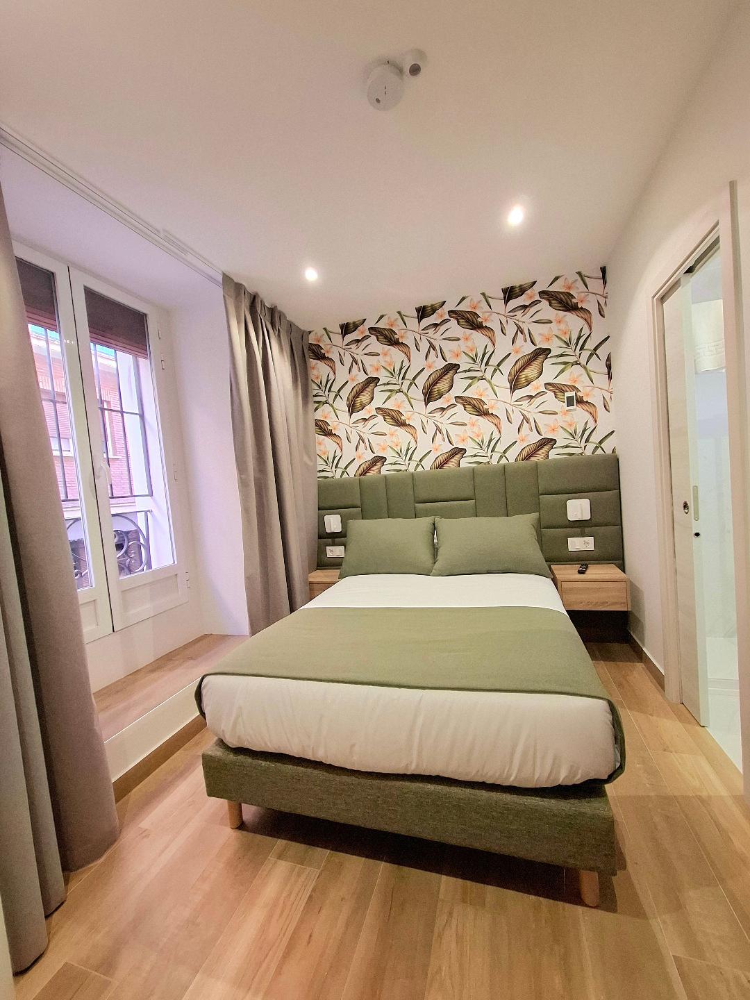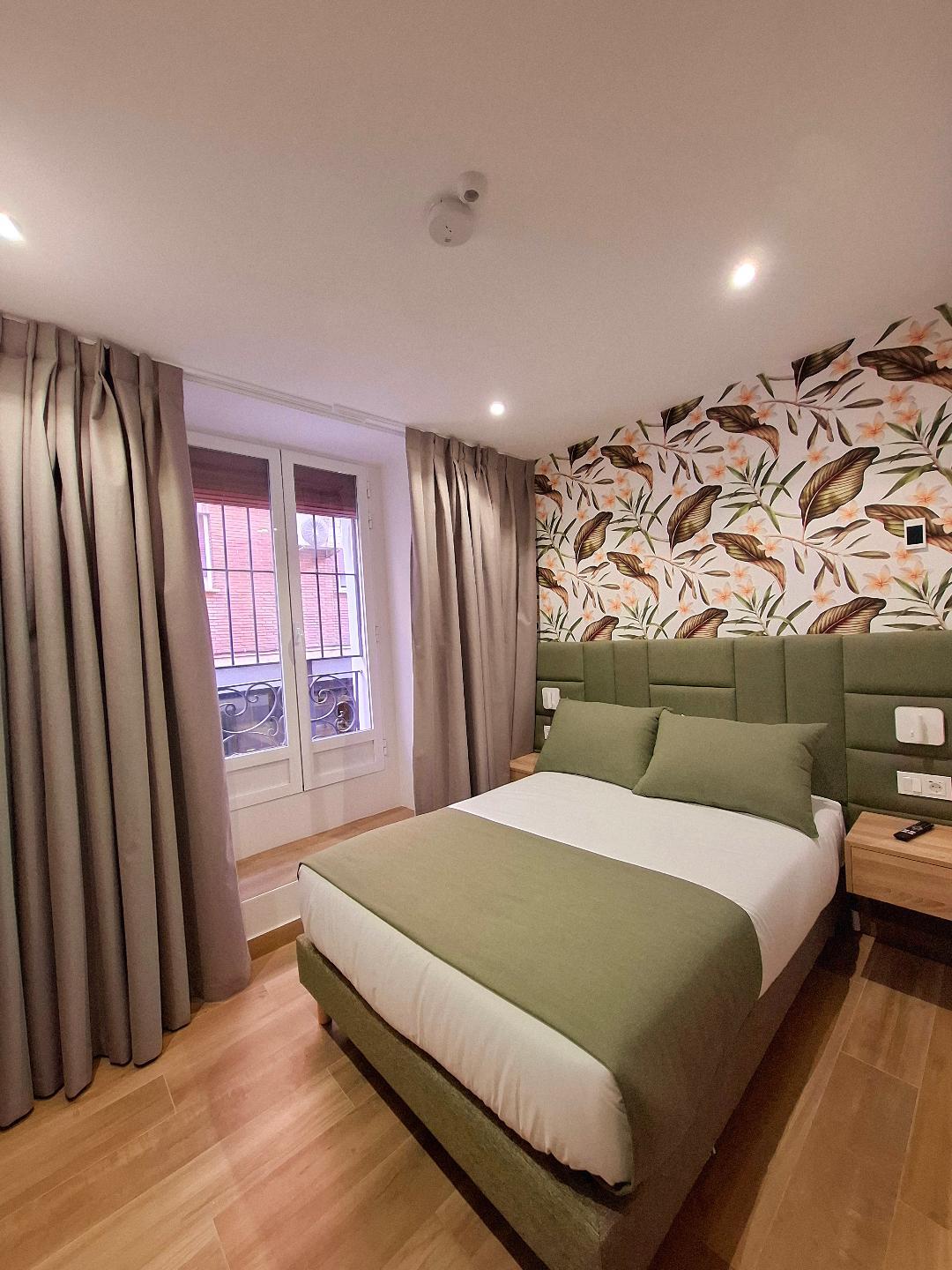 Cama con cabecera verde y mural floral, junto a cortinas y apliques en una habitación.